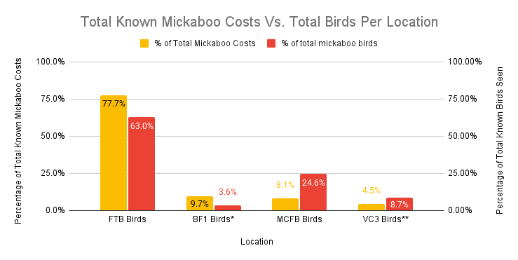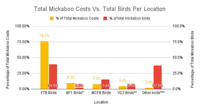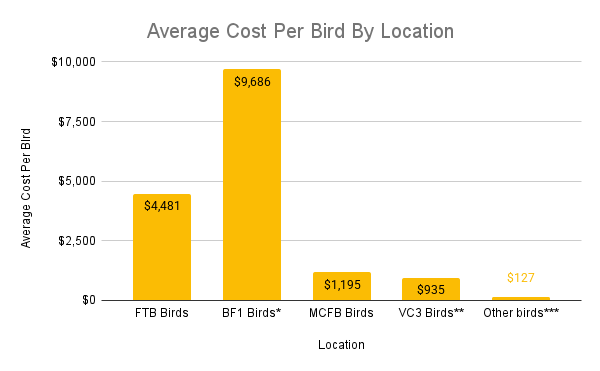 Adjusting for this concentration, the average cost per bird was $4,481 at For the Birds, $9,686 at Boarding Facility One, $1,195 at MCFB, an estimated $935 per bird at VC3, and $127 per all other birds in Mickaboo’s system.