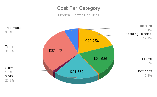 To facilitate comprehensive analysis, we manually input data from these invoices into a Cost Analysis spreadsheet. This has allowed us to create an overall view of our expenditures and generate sortable documents. Our primary objective is to determine the percentage of Mickaboo’s veterinary expenses incurred at each vet clinic and boarding facility, and to analyze the services provided to the birds.