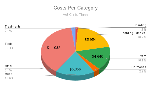 The total expenditure for the twelve non-sequential invoices available from Vet Clinic Three amounts to $28,992, covering 31 individual birds. Even if this figure were doubled, it remains significantly lower than the totals reported by For the Birds and also below the Boarding Facility One totals.