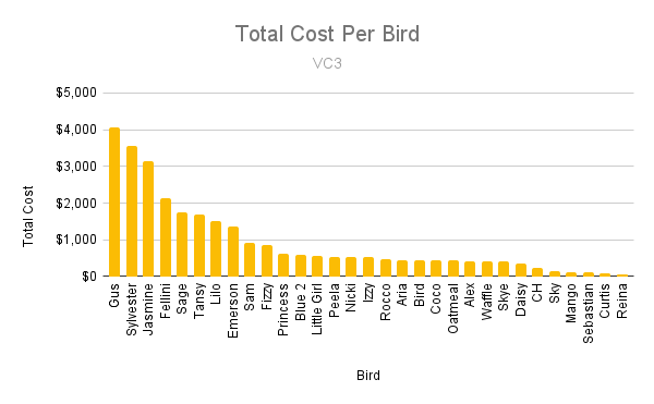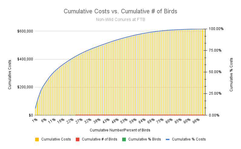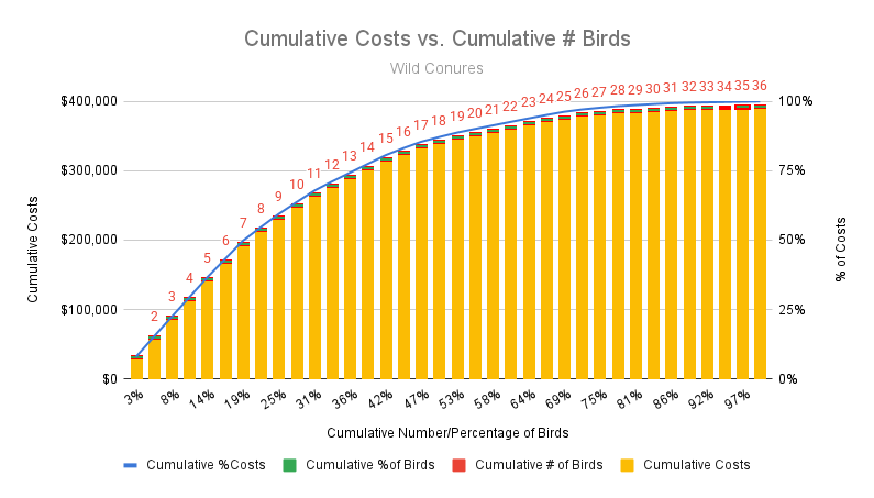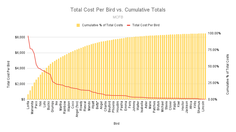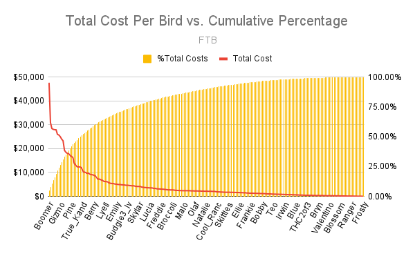 This can be broken down further. Half of the total Wild Conure veterinary costs at For the Birds, amounting to $196,043, were spent on just seven birds, averaging $28,000 each. Furthermore, 90% of Wild Conure costs ($352,878) were incurred by twenty birds, with an average cost of $17,650 per bird.