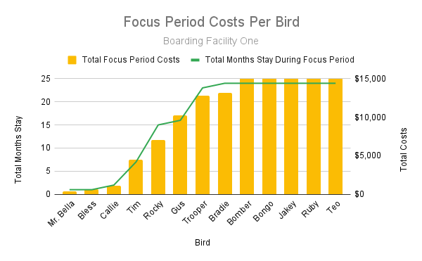 During our 24-month focus period, 13 birds (8 macaws and 5 cockatoos) were boarded at BF1. The cost per bird was determined solely by the length of their stay and species. On the whole, macaws had slightly higher costs than cockatoos. Of these, six birds (Bradie, Bomber, Bongo, Jakey, Ruby and Teo) remained at the facility for the entire focus period.