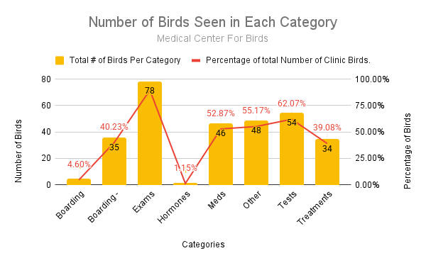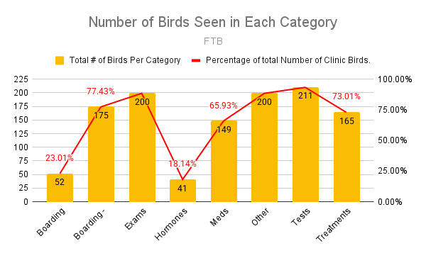 The data in ASM includes very few costs or invoices from any of the other seven or so veterinarians we use, making it impossible to determine exact totals of costs and birds. Once we have subtracted the costs and number of birds from available data, we are left with a category of “other birds.” This is a relatively small amount of money, for a large number of birds. We don’t have a final tally of birds that received vet care, so it is impossible to tell how many did not or how much each bird that received care cost.