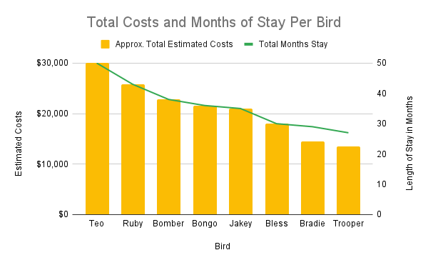 Eight birds have stayed between 27 and 50 months, prompting an analysis of total costs per bird. To estimate these costs, we used conservative average monthly figures: $500 for cockatoos and $600 for macaws. These estimates were based on average monthly costs per species, adjusted downward to account for cost increases since the stay of the first bird, Teo, began. As expected, Teo’s total costs were the highest, amounting to $30,000.