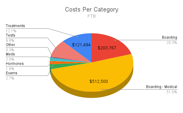 The majority of Mickaboo’s spending went toward boarding services, both medical and non-medical. At FTB alone, 72% of costs were for boarding, with long-term stays common. A small number of birds drove a large portion of expenses—23 birds (4% of the total population) accounted for 50% of FTB’s total costs.