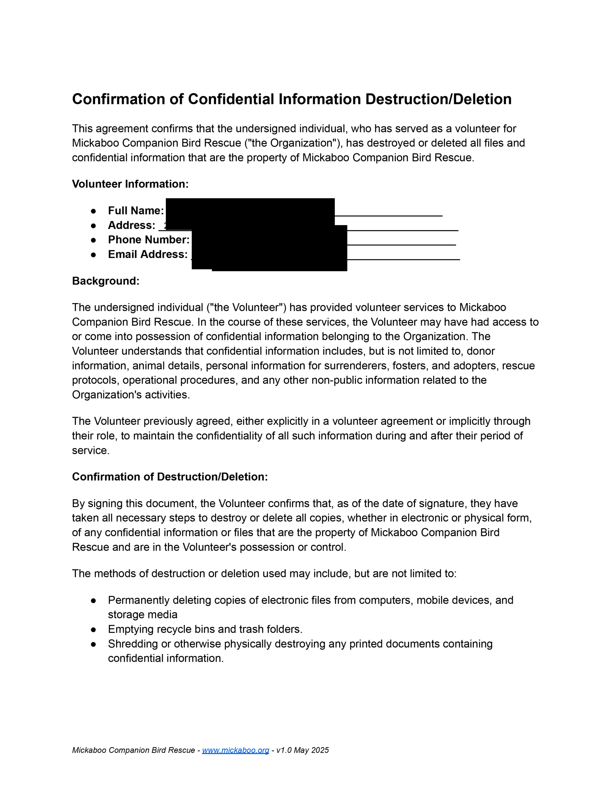 We are a group of current and former volunteers and insiders, deeply troubled by systemic failings within the Mickaboo organization, stemming from a leadership team with no accountability, which prioritizes control and self-preservation over transparency, ethical care and mission-driven decision-making. We would not place our own birds with Mickaboo if we were no longer able to care for them ourselves, and cannot in good conscience allow others to do so, or continue to donate, without more transparency from the organization.