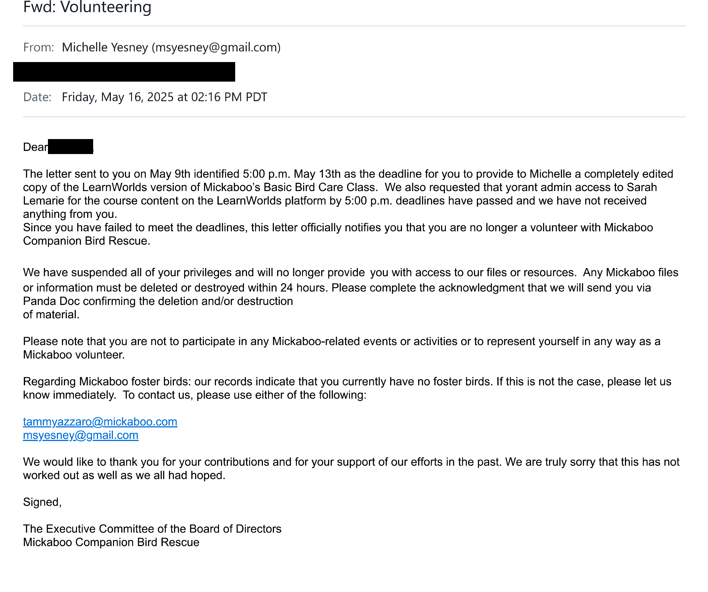 Leadership has accused us of pursuing a personal agenda that is misaligned with Mickaboo’s values, asserting that those who disagree should simply leave. But our agenda is—and always has been—transparency, accountability and oversight in service of what should be everyone’s shared goal: providing the highest standard of care for the birds.