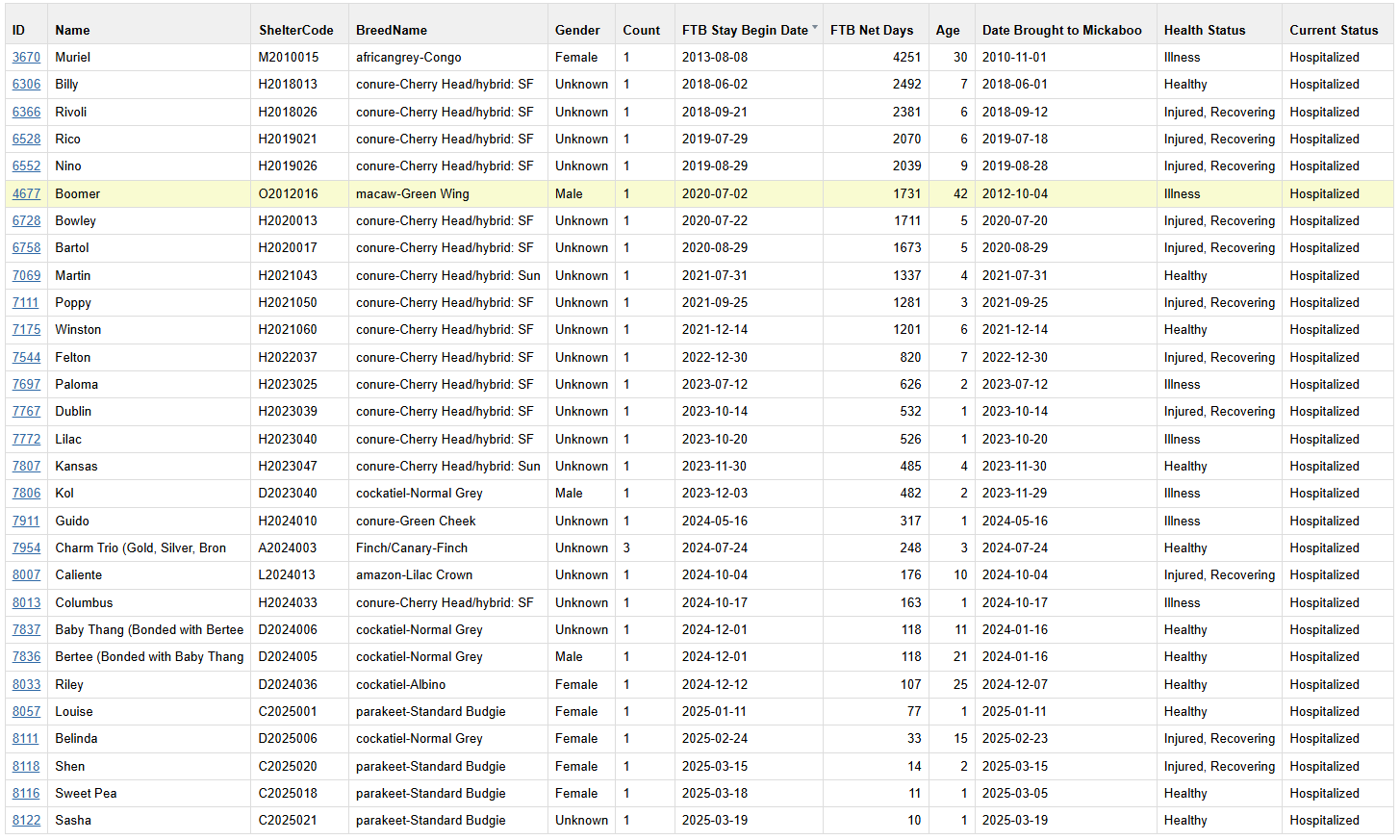 • Neglect of Challenging Birds: Birds labeled as “damaged” or “aggressive” are often transferred to FTB, where they are effectively abandoned and forgotten, receiving little to no effort toward focused efforts at rehabilitation or, ultimately, placement. These birds remain where they are, without an exit strategy, at significant costs to Mickaboo.