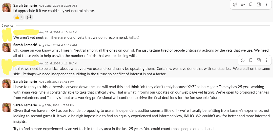 Resolving leadership gaps is just one of many issues the board has consistently neglected. Internal communications show that board members are fully aware of the organization’s systemic problems, yet they repeatedly fail to take meaningful action. The wild conure situation, for example, has been debated for years without resolution. As recently as the October board meeting,32Recorded notes available on request Tammy acknowledged Mickaboo could no longer manage both domestic parrots and wild conures, admitting, “It’s just too much.” She then expressed a wish that someone would create a separate organization for the conures—similar to Palomacy.