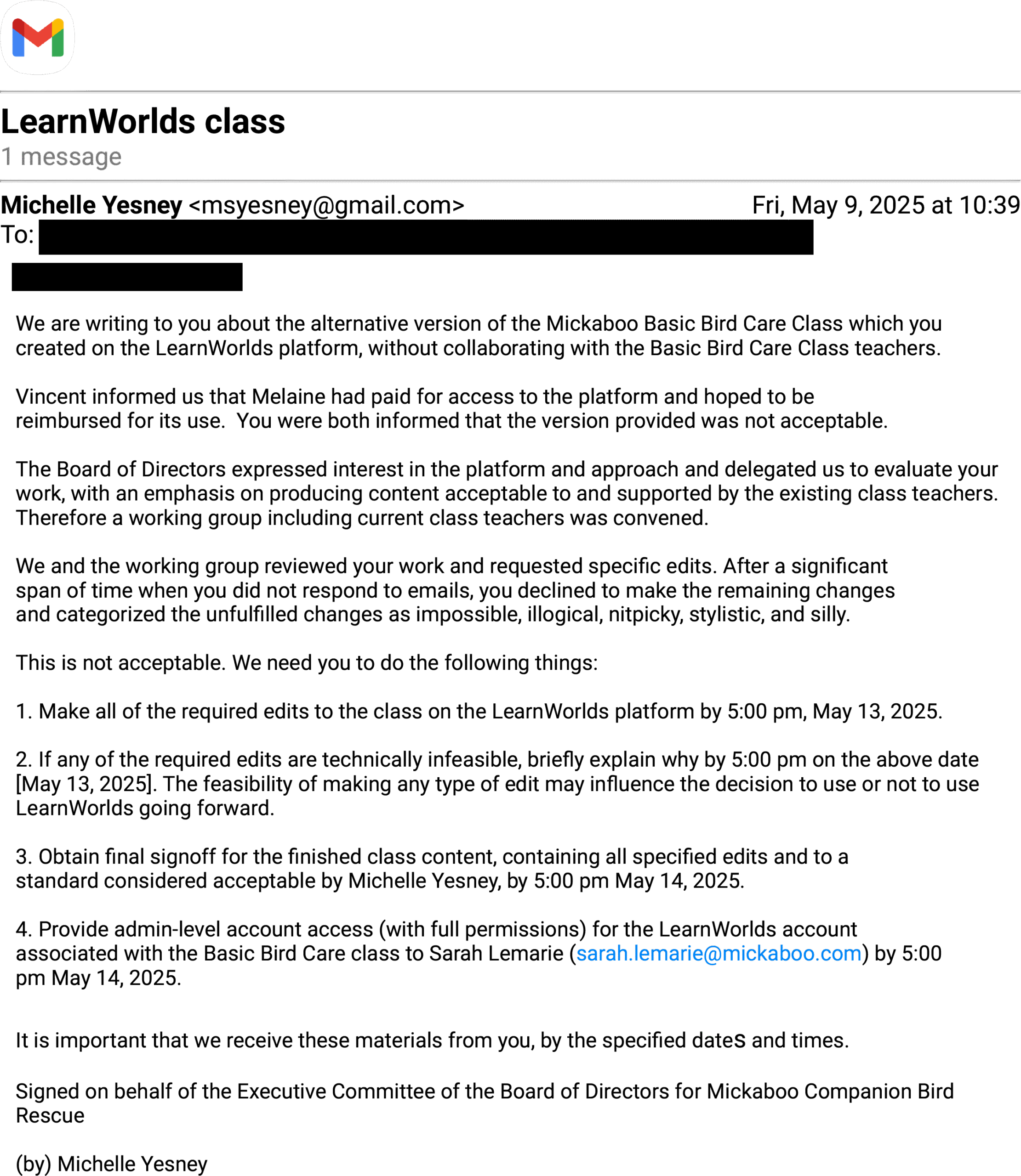 Recent events have taken an interesting turn. On May 9, 2025, Michelle Yesney emailed the volunteers who created the training class, demanding that they implement all requested changes and grant Sarah administrative access to the platform by 5 p.m. on May 14. No consequences were stated at the time. Nevertheless, on May 16, Michelle sent another email, informing these volunteers that, because they had not met the deadline, they were being expelled from Mickaboo.