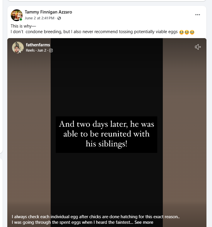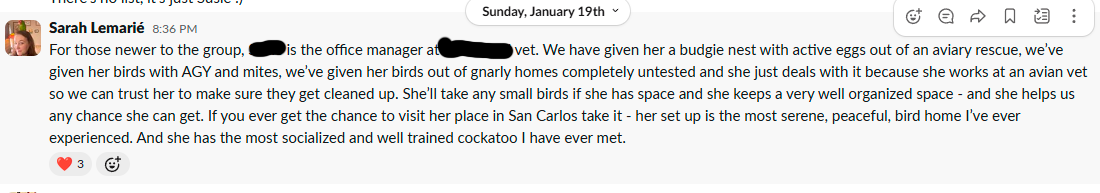 In a Facebook forum post, Tammy stated that she never recommends discarding eggs that might be viable. Similarly, in a Slack message, Sarah mentioned that a nest of viable eggs from an aviary rescue had been given to the office manager at another vet clinic Mickaboo works with.
