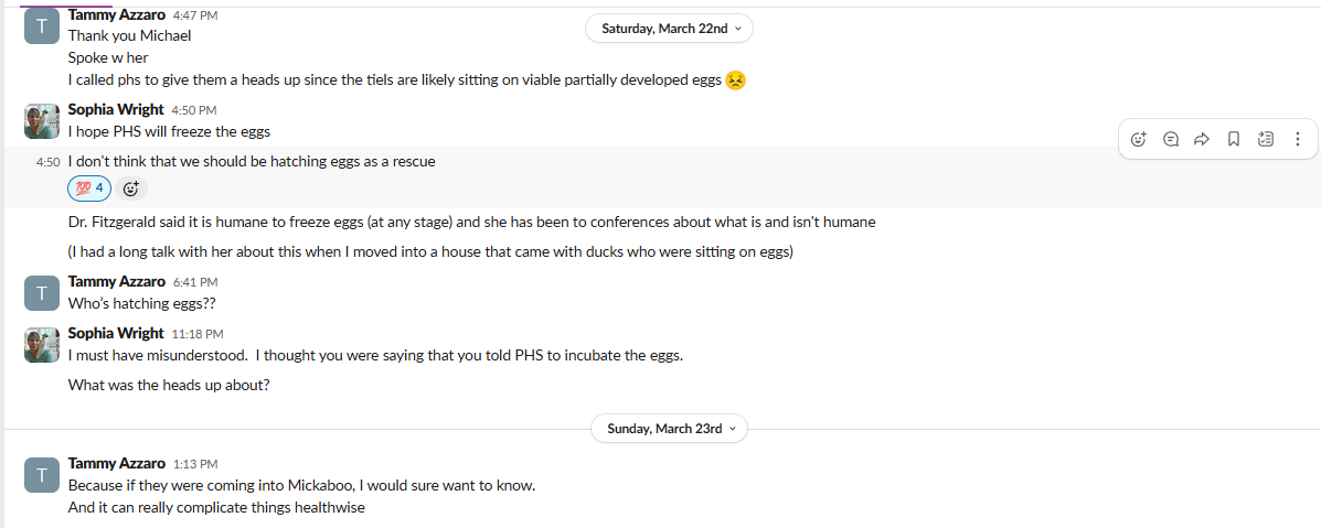 The incubating and hatching of eggs found in nests during rescues is a concerning practice that has occurred at Mickaboo, despite leadership’s strenuous denials. This contradicts Mickaboo’s ethos of discouraging breeding. We are not sure how often this happens, because as with most things in Mickaboo, the practice is opaque. In fact when a volunteer brought up the subject, Tammy responded, “who’s hatching eggs.” If someone in Mickaboo were hatching eggs, she said, she’d want to know. However, there are references to it in Slack conversations and, during a large rescue, at least one volunteer1 reported being tasked with finding viable eggs.