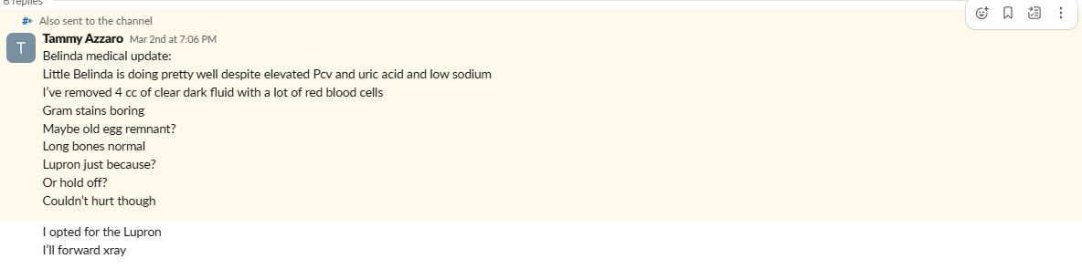 Concerns have also been raised about veterinary protocols at FTB recommended by Dr. Van Sant.5Discharge Report Showing care recommendations with questionable protocols highlighted. These include the routine use of hormone treatments like Lupron6Tammy recommending Lupron just for the heck of it and Deslorelin (an FDA-indexed drug not approved for birds), discouragement of enrichment items like chewable and shreddable toys, and questionable dietary recommendations. These practices often contradict current avian veterinary literature and behavioral science, resulting in over-medicalization and inadequate behavioral support.